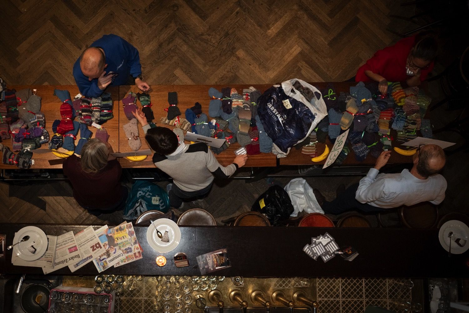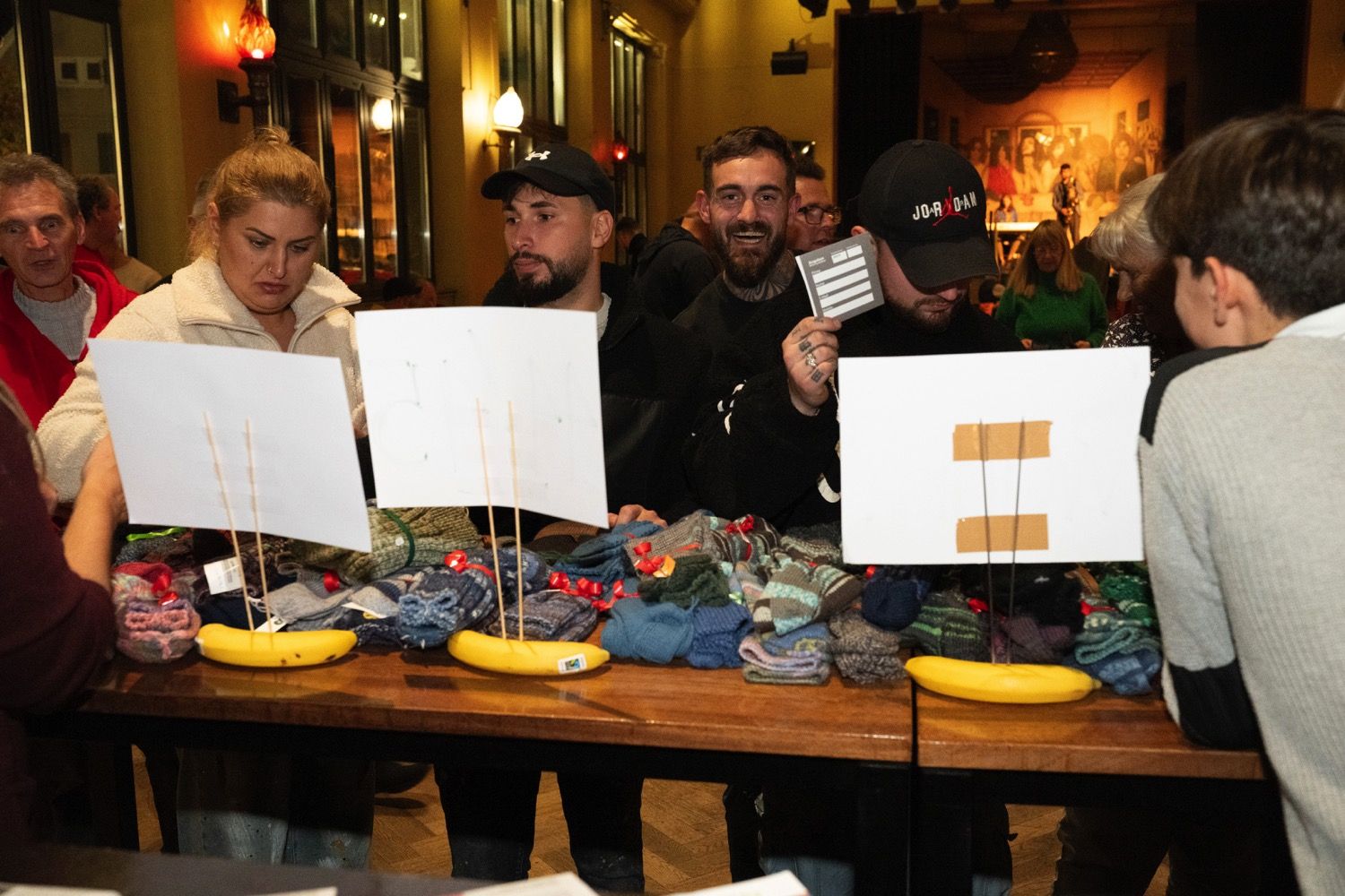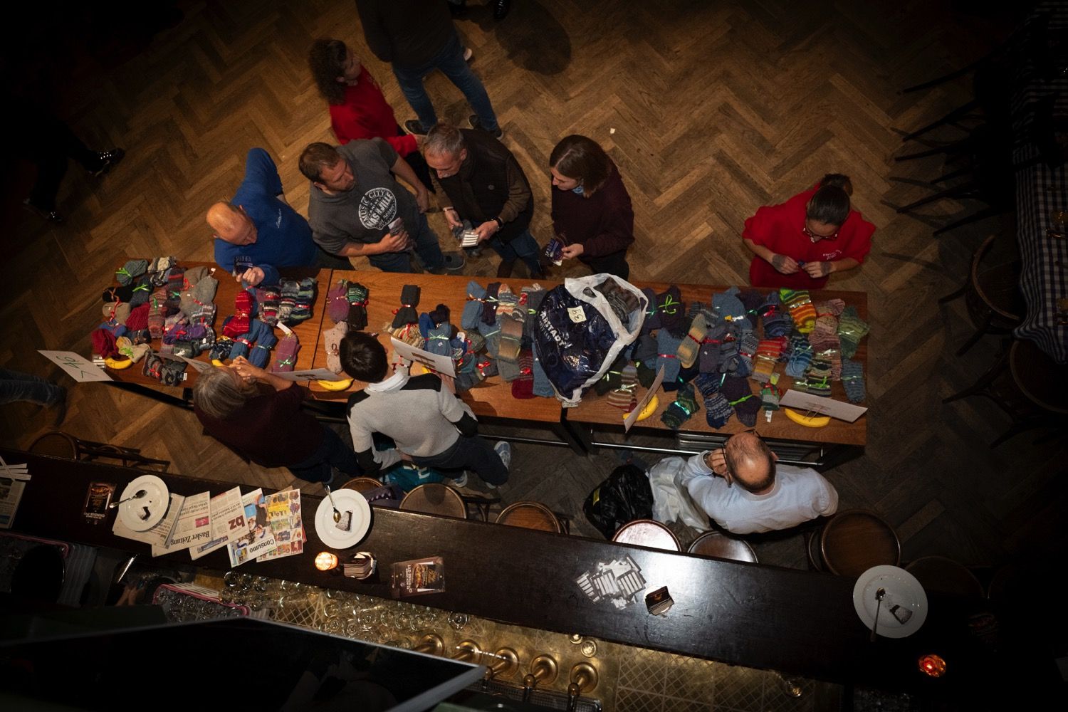 „Soggeball" nennt sich der illustre Anlass, der alljährlich in der zweiten Woche der Basler Herbstmesse stattfindet. Soggeball" deshalb, weil am Ende des Abends wollene handgestrickte Socken verteilt werden. Dazu gibt es für alle ein Päckli selbstgebackene Gutzi.